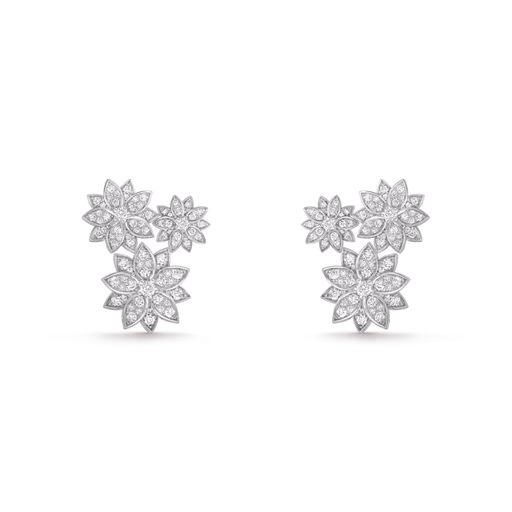 Lotus Earrings, 3 Flowers – 18K White Gold with Diamonds