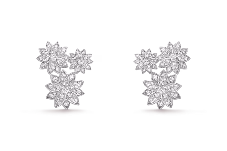 Lotus Earrings, 3 Flowers – 18K White Gold with Diamonds